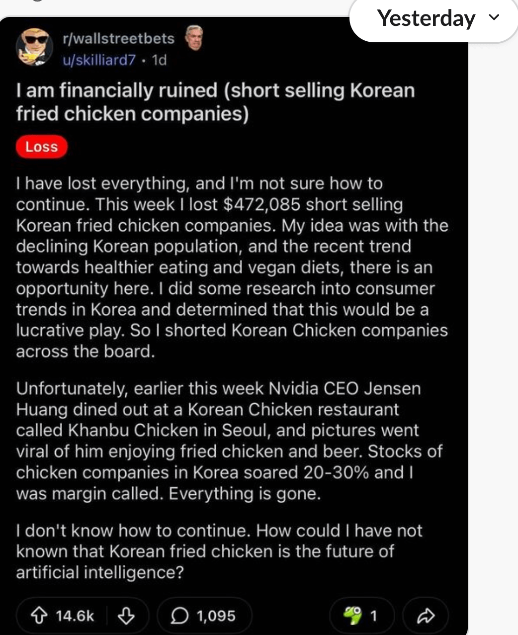In case you can’t read that on your phone, poor “skilliard7” lost $472,085 short-selling Korean friend chicken companies.