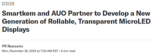 November 2024: Smartkem and AUO Partner to Develop a New Generation of Rollable, Transparent MicroLED Displays. AUO is “the largest display manufacturer in Taiwan.” [emphasis added]